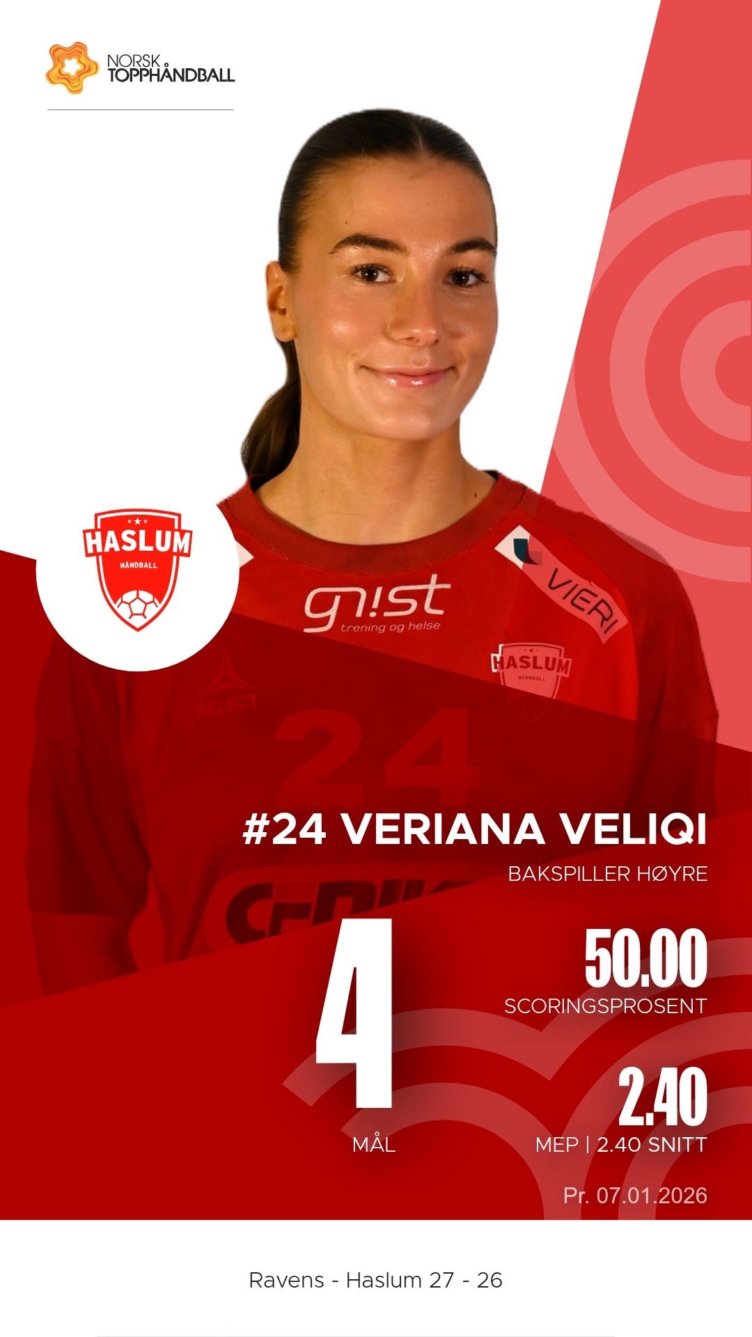 For Haslum var Andrea Nalbant Moe og Sofie Fosnæss Hanssen de mest toneangivende. Moe endte med seks mål og flere assists, mens Hanssen var sikker fra venstrekanten. Bakspiller Veriana Veliqi bidro med fire mål og gode pasninger, men det holdt ikke helt inn.